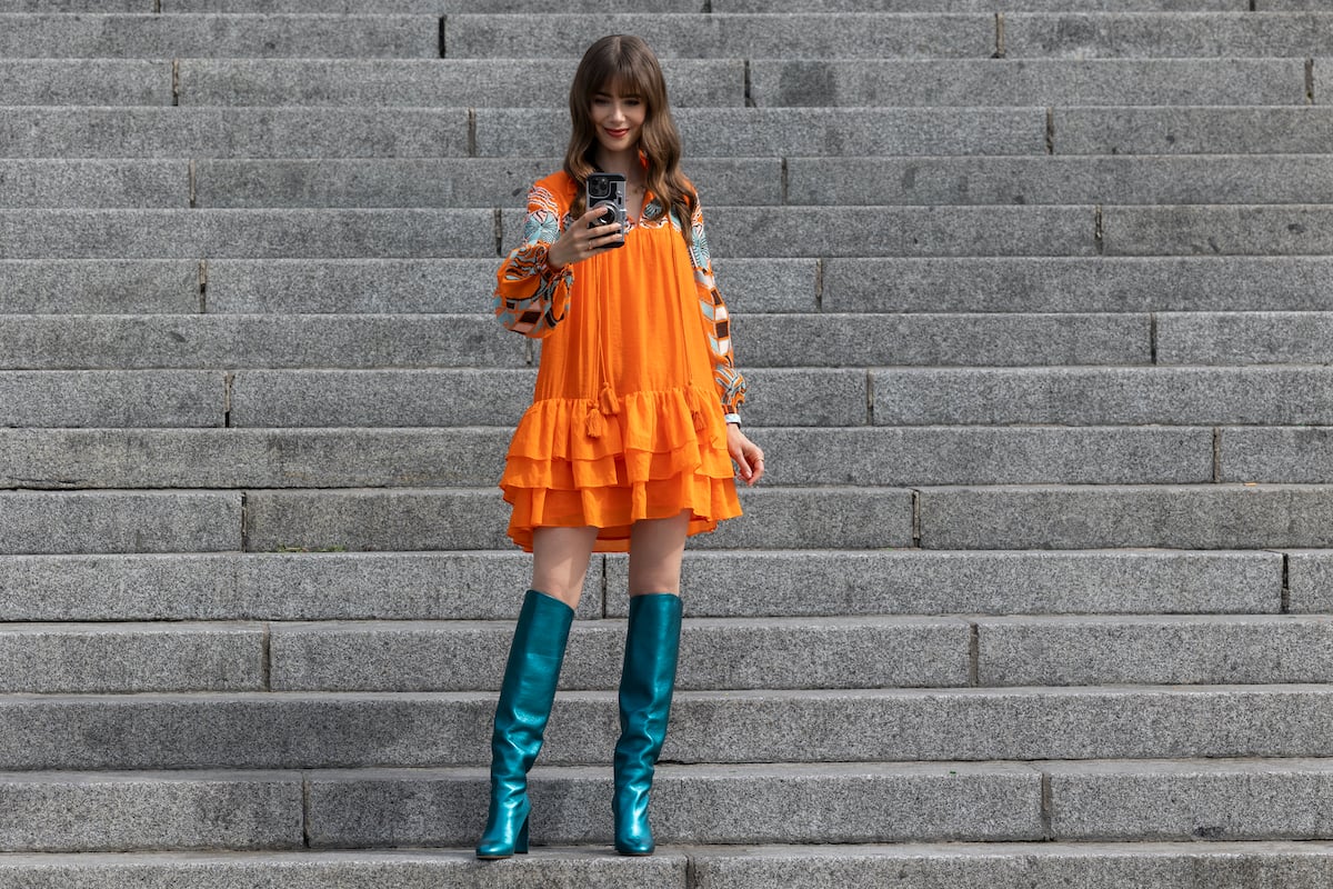 Set đồ xuất hiện trong tập 4, mùa 3 là một trong những ví dụ điển hình của việc tận dụng công thức phối màu color-block của Emily. Chiếc đầm cam dáng suông đến từ bộ sưu tập Iris Apfel x H&M kết hợp với đôi giày bốt cao đến đầu gối màu turquoise của Maison Skorpios tưởng chừng như là một sự “lạc quẻ”. Ấy vậy mà sự tương phản trong màu sắc, cùng với sự hài hòa giữa cấu trúc và chất liệu trang phục đã giúp Emily Cooper toát lên nét phóng khoáng đặc trưng của thời trang Mỹ.