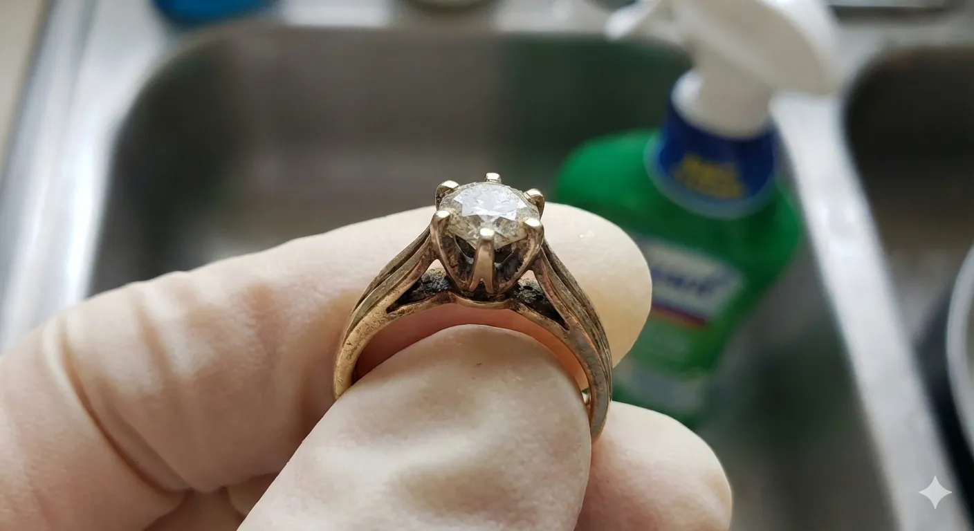 Bất cứ khi nào tiếp xúc với hóa chất mạnh (nước tẩy bồn cầu, nước lau kính), hãy tháo nhẫn. Việc tháo nhẫn không chỉ bảo vệ kim loại mà còn bảo vệ các kẽ đá khỏi bị bám cặn hóa chất gây dị ứng da tay.