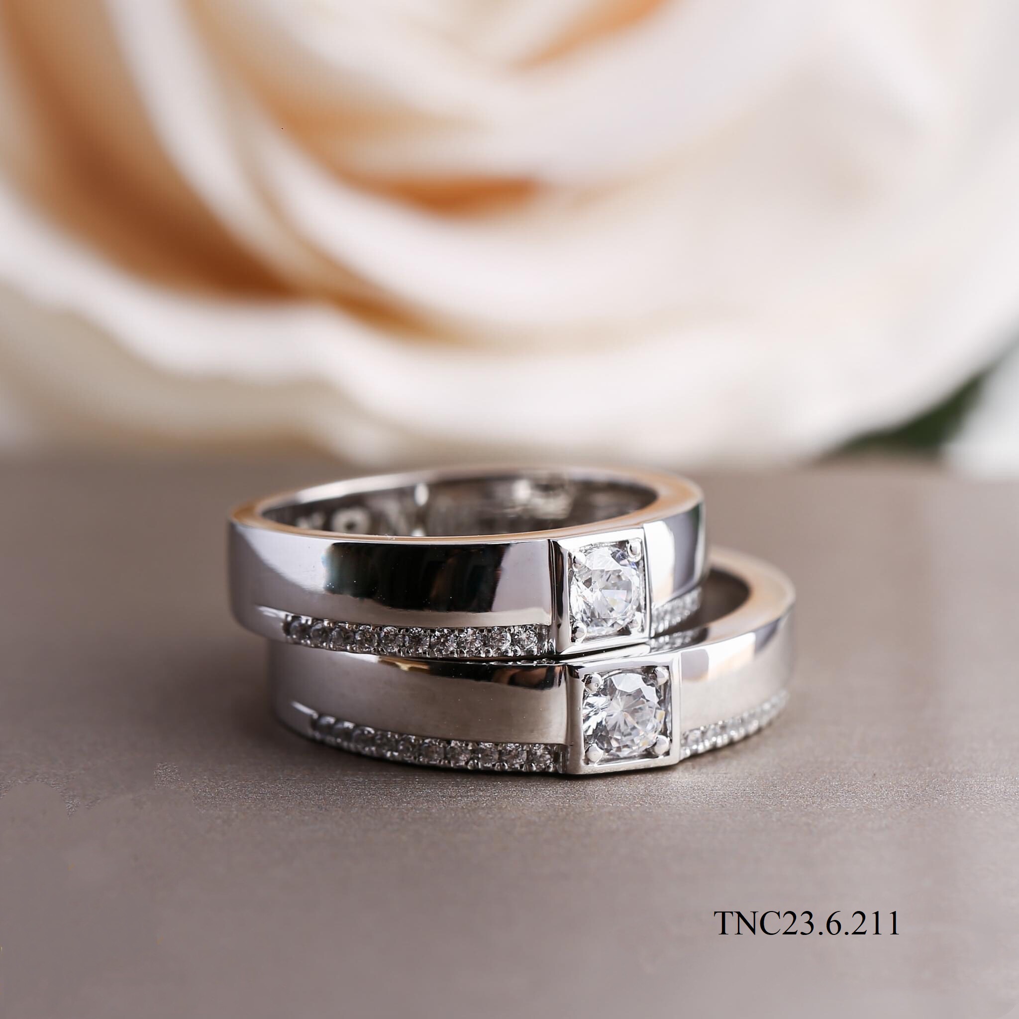 Được thiết kế bởi thương hiệu Skymond Luxury, mẫu nhẫn cưới TNC 23.6.213 là một trong những lựa chọn hàng đầu cho các cặp đôi quan chức. Với kiểu dáng đơn giản nhưng sang trọng, nhẫn cưới này được làm từ vàng trắng 18K, với một viên kim cương lớn và những viên kim cương nhỏ xung quanh tạo nên sự lấp lánh và đẳng cấp. Điểm đặc biệt của mẫu nhẫn này là việc khắc tên và ngày kỉ niệm cưới của hai người trên bên trong nhẫn, tạo nên sự độc đáo và ý nghĩa cho ngày này.