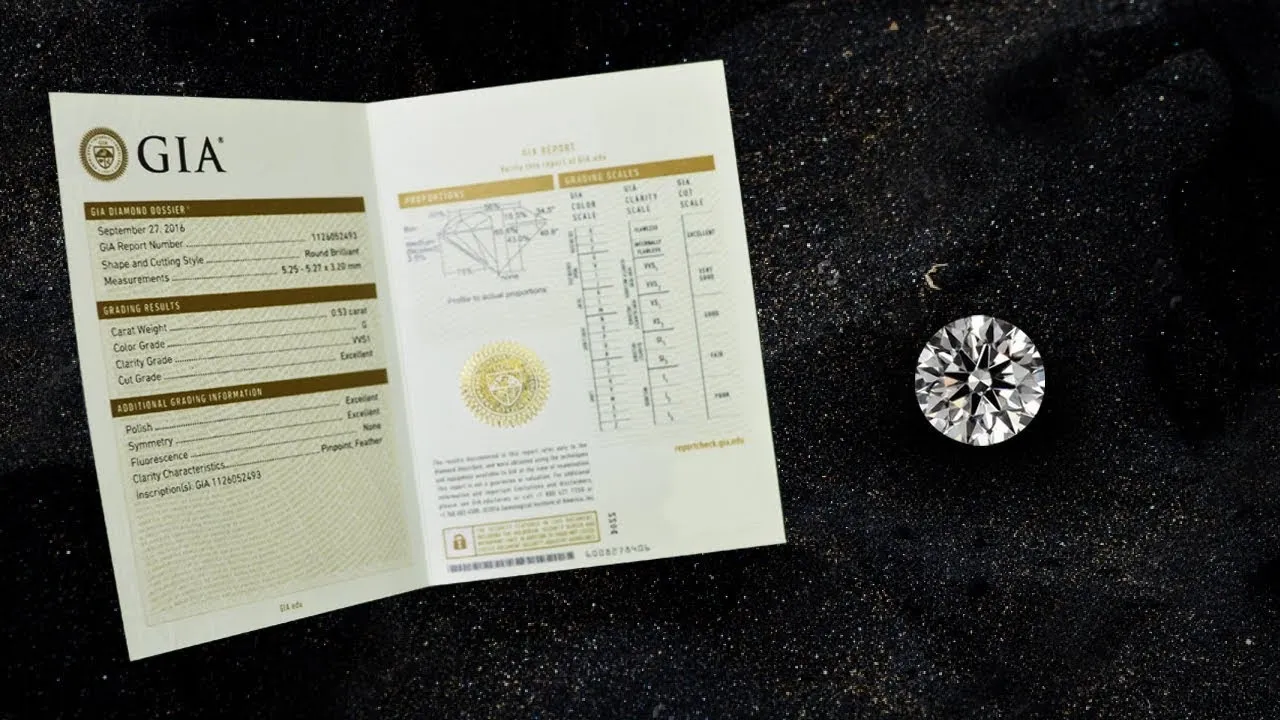 - Giấy chứng nhận kim cương: Nếu nhẫn mới có kim cương, bắt buộc phải có chứng thư GIA hoặc GIV. Việc sở hữu giấy tờ đầy đủ cũng giúp bạn dễ dàng bảo hiểm trang sức hoặc bán lại nếu cần thiết.