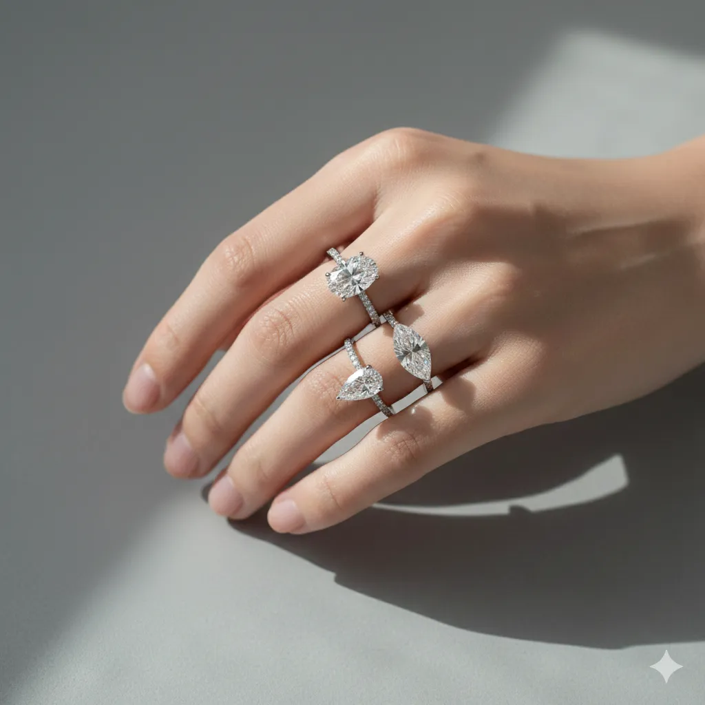 Quy tắc là "không chọn bản nhẫn quá dày". Khi chọn viên chủ nhẫn cưới, hãy ưu tiên giác cắt Tròn (Round Brilliant) hoặc Princess (Vuông). Bản nhẫn mỏng khoảng 1.8mm sẽ giúp tạo khoảng trống da thịt, khiến ngón tay trông dài hơn thực tế.