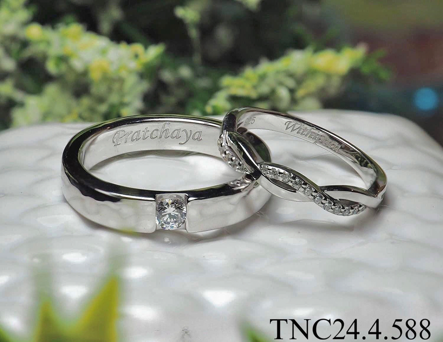 Cặp nhẫn cưới TNC 24.4.588 với chất liệu vàng trắng, khắc tên và ngày tháng năm cưới bên trong, tạo thành kỉ niệm đáng nhớ với những cặp đôi