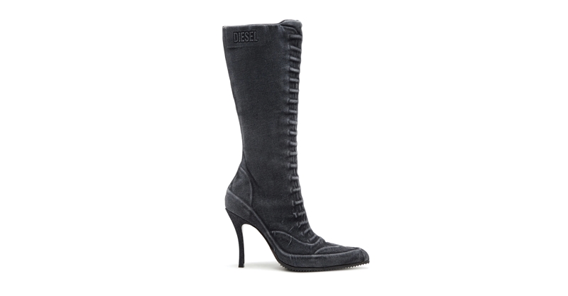 Chúng ta vốn đã quen thuộc với những bộ trang phục denim được xử lý bằng cách giặt mài để tạo ra các mảng màu phai tự nhiên hoặc bề mặt rách. Ở Diesel, Glenn Martens đã cho giới mộ điệu chiêm ngưỡng phương pháp xử lý denim bằng kỹ thuật trompe l’oeil. Trong bộ sưu tập Xuân Hè 2024, đôi giày bốt cao gót bằng denim – thiết kế được phối cùng những bộ trang phục mô phỏng sự tan rã – được Glenn mài bề mặt tạo thành mô-típ lỗ xỏ và dây giày vô cùng chân thật.