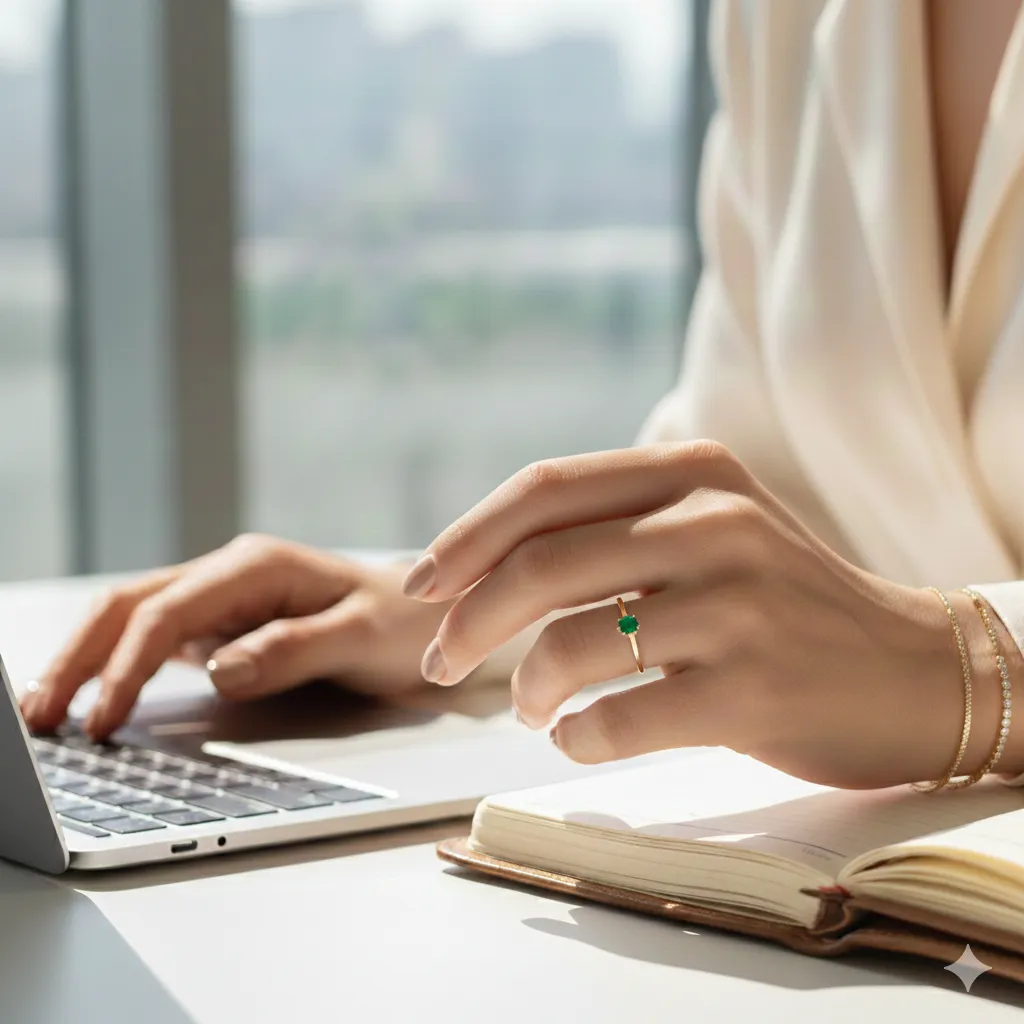 - Minimalism (Tối giản): Một chiếc nhẫn mảnh đính một viên đá màu chủ đạo (Solitaire) giúp bạn giữ được sự chuyên nghiệp trong các cuộc họp quan trọng.