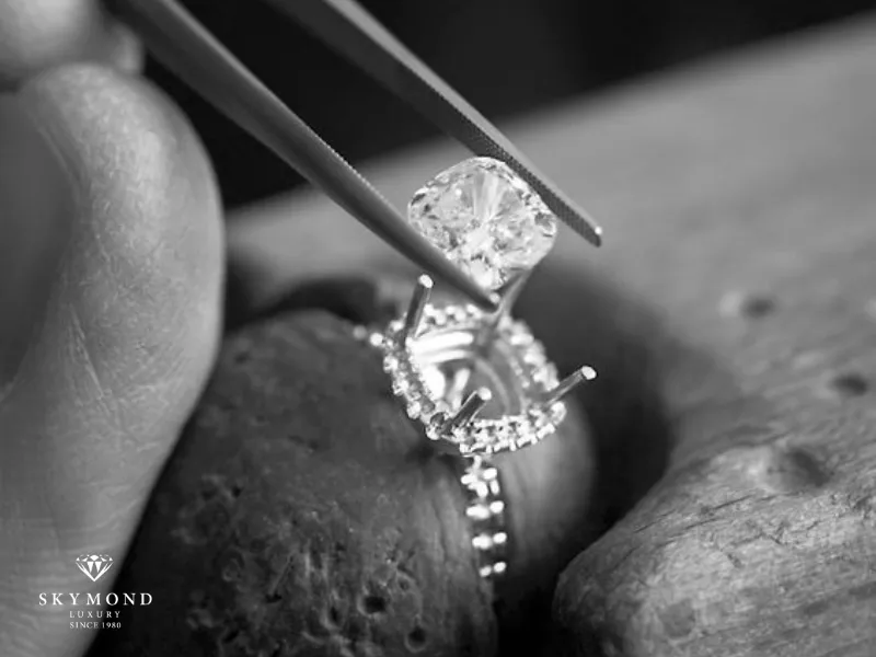 - Kỹ thuật Halo: Bao quanh viên chủ GIA bằng một vòng kim cương tấm nhỏ, giúp viên đá trông to hơn 20-30% và tăng cường độ lấp lánh tổng thể.