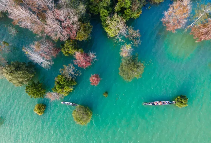 2. Du ngoạn lòng hồ Rào Quán: Ở một góc nhìn khác, việc ngồi trên những con thuyền nhỏ trôi lênh đênh giữa lòng hồ mang lại cảm giác bình yên đến lạ lùng. Từ giữa lòng hồ, du khách có thể phóng tầm mắt bao quát cả một dải lụa đỏ uốn lượn quanh các triền núi. Tiếng mái chèo khua nước hòa cùng tiếng chim rừng tạo nên một bản nhạc không lời du dương. Đây là cách thưởng ngoạn dành cho những tâm hồn thích sự tĩnh lặng, trầm mặc.