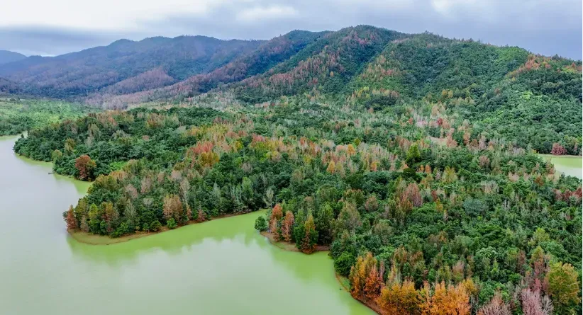 Sự khác biệt của rừng phong hương miền Tây Quảng Trị so với những nơi khác chính là sự cộng hưởng của địa hình. Cánh rừng nằm thoai thoải bên cạnh lòng hồ thủy điện Rào Quán—một công trình thủy lợi, thủy điện khổng lồ. Hồ Rào Quán không chỉ đóng vai trò điều tiết nguồn nước mà còn là chiếc "gương thần" khổng lồ soi bóng đại ngàn. Những ngày trời trong xanh, mặt nước hồ phẳng lặng như tờ, mang sắc xanh ngọc bích thẳm sâu. Khi nhìn từ trên cao, sắc đỏ của lá phong và sắc xanh của nước hồ tạo nên một sự tương phản thị giác cực mạnh, một bản phối màu tinh tế mà không danh họa nào có thể sao chép hoàn hảo.